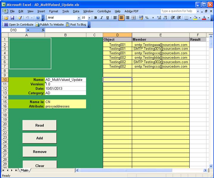 This spreadsheet is for the bulk changing of multivalued Active Directory objects. Individual values in a multivalued attribute collection can be added or removed. The Objects will not be accessed directly, the spreadsheet will generate powershell scripts that can be executed by administrators.