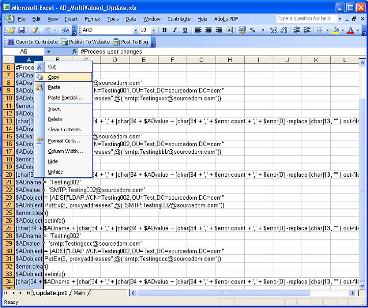 Within the "update.ps1" sheet highlight column A, right click and select copy.