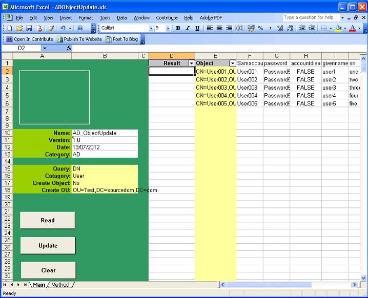 Will read the objects specified in column E sequentially populating the LDAP attributes specified as row headers, column F and Higher. This provides the same functionality as the AD_Query spreadsheet. |