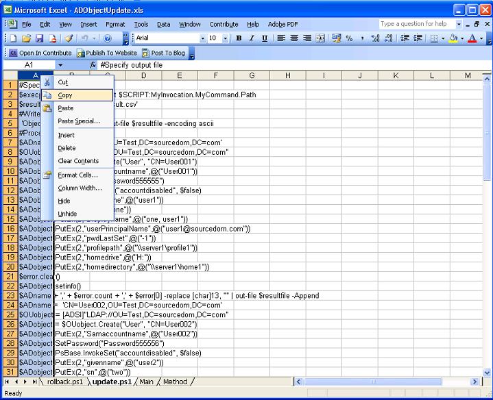 Within the "update.ps1" sheet highlight column A, right click and select copy.