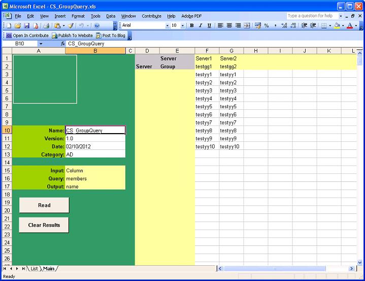 The objects to be read are specified in Column D and E starting cell D3 and read sequentially through column D until an empty cell is found, The membership of the objects are listed in the same row as the header in column D and E.
